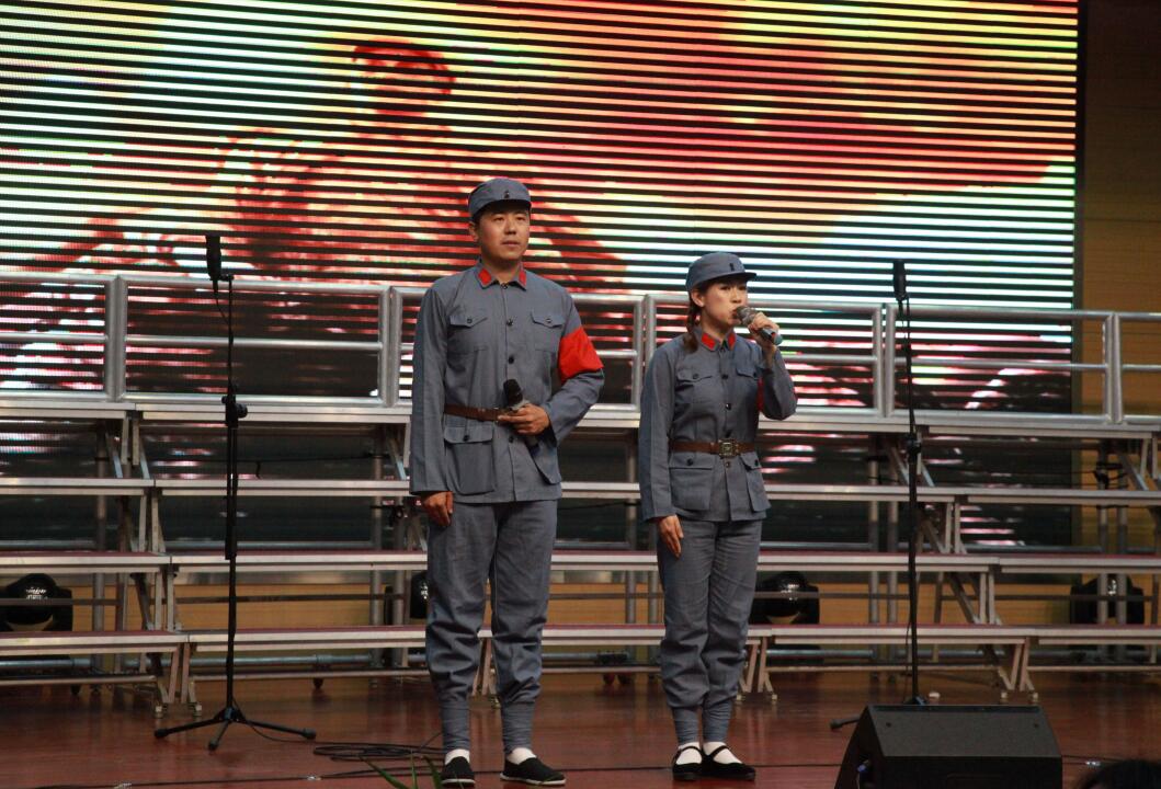 ?? 紅歌會活動現(xiàn)場,《鼓浪嶼之波》《歌唱祖國》《山丹丹開花紅艷艷》《我愛你中國》《我和我的祖國》《祖國不會忘記》《天耀中華》等十七首經(jīng)典愛國歌曲輪番上演,歌聲在會場上空飄蕩。集團公司現(xiàn)場合唱的是紅色經(jīng)典歌曲《在太行山上》。歌曲由三個部分組成。第一部分為詩歌朗誦。表達了抗戰(zhàn)時期中國軍民艱苦卓絕的奮斗歷程和大無畏的革命樂觀精神;第二部分為情景表演。描繪了八路軍戰(zhàn)士們在戰(zhàn)場上揮舞著紅色旗幟,在沖鋒的號聲中,向敵人的陣地發(fā)起沖鋒,受傷的戰(zhàn)士在衛(wèi)生員和戰(zhàn)友的攙扶下在戰(zhàn)場上繼續(xù)前進的場景。第三部分為歌曲合唱。演員們身著八路軍軍裝,精神抖擻,情緒高昂,歌聲嘹亮,仿佛把大家?guī)肓藨?zhàn)火紛飛的年代,給人以催人奮進,所向披靡的力量,兩個聲部相互配合,高低呼應(yīng),逐步將歌曲推向高潮。